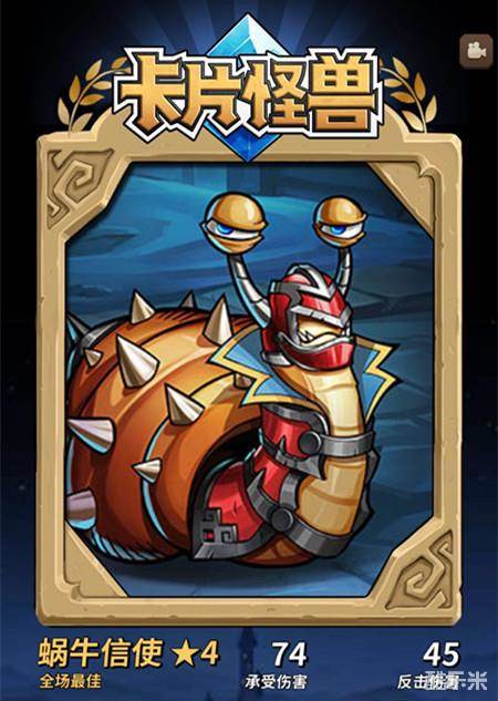 那么首先冲最最可怕的蜗牛信使开始,它虽然没有攻击,血量也不算拔尖,但等级起来后的强大减伤和反伤在加护甲加成,让它成为不俗彩卡的盾。