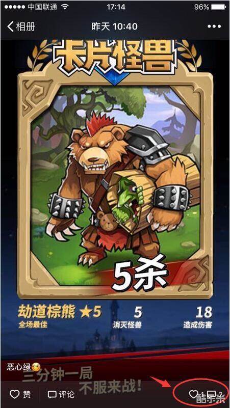 最后编辑于7年前都说自己是天梯一霸?老板娘不信!各位牌士,分享带有“三杀”、“四杀”或更高杀害的游戏结算页面到微信朋友圈或QQ空间,然后将分享出去的截图回帖至此,即可赢取丰厚奖励!牌士们,show出你的怪兽杀!