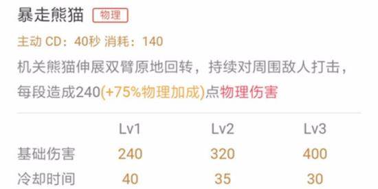 解析:该技能优点是对敌方英雄持续伤害高,并且攻击范围广,缺点是cd时间长,法力消耗多。该技能一般多配合小霸王护盾或者机关魔爪打出一定的控制效果后再释放,这样会使得暴走熊猫打出更多的持续伤害。同时收割时,此技能也有非常理想的效果。也可以通过该技能的多段伤害来攻击防御塔从而恢复血量。