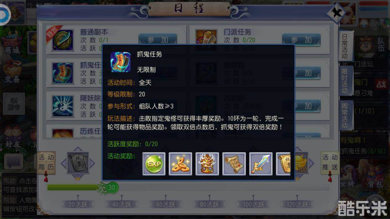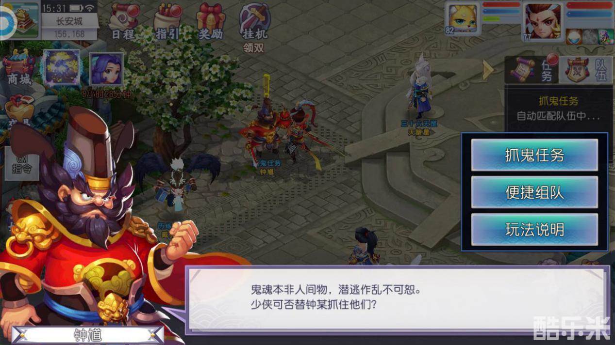1、只有等级达到20以上的玩家组成3人以上的队伍才可在钟馗处进行捉鬼任务。