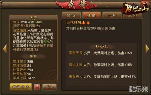 两军对垒,火拼过后总会有人员伤亡,此时你的替补武将大乔登场,使出觉醒技“沉鱼落雁”,帮助己方全体友军回复35%计策攻击的兵力,同时净化所有不良状态,并有概率让随机两名敌军陷入晕眩1回合。吃完“士力架”后,整个队伍又充满能量,猛攻再次发起,胜利还不是手到擒来。
