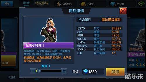 战力34837、血量5275、防御4250、暴击30.3%、换单速度36.5%、命中率96.5%、受伤躲闪380、攻击间隔1.1