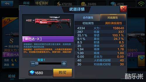 对战属性:火力158640、伤害337、穿透100.1%、暴击24.7%、射速8.5、弹夹42、填弹1.78、精准1.00、后座力0.00