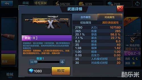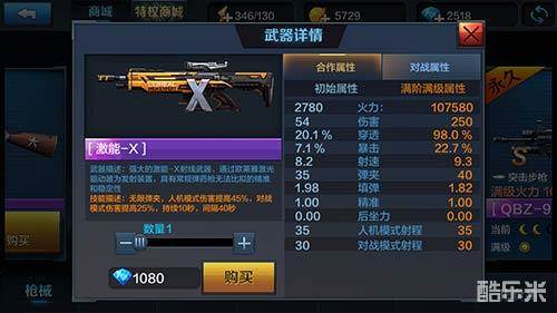 首先我们还是来看看属性合作模式(满级):火力107580、伤害250、穿透98%、暴击22.7%、射速9.3、弹夹40、填弹1.82、精准1.0、后座力0.00、人机模式射程35、对战模式射程30