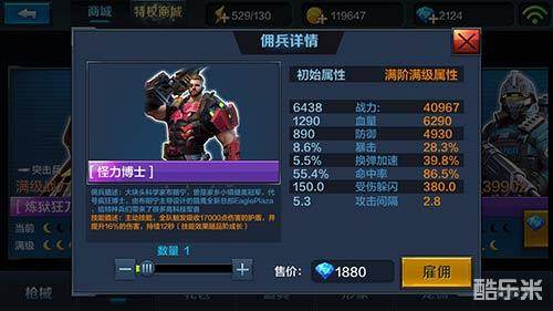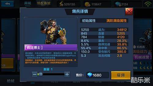 疯狂博士:战力40967、血量6290、防御4930、暴击28.3%、换弹加速39.8%、命中率86.5%、受伤躲闪380、攻击间隔2.8