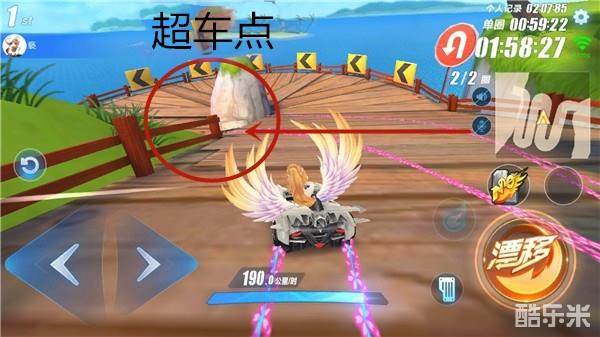 赛道中篇后段有一条连环弯道,初到这段赛道时,车手会面临一段木桥弯道飞跃(如下图),如果等到落地后在漂移,车手将会撞上赛道,丧失大量速度。这里要在贴近木桥的一瞬间就进行漂移,这样将会避免与赛道发生碰撞,同时也能收集到比正常漂移更多的氮气,这样以来便拉开了与普通车手间的差距。