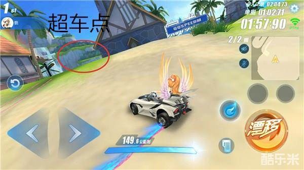 在赛道中其实还有一个隐藏超车点,该超车点位于终点处的小房子间,(在下图中已经标出)车手在出木桥之后立刻使用氮气加速从小房子间穿过可以节省不少的距离,这样便可以“扭转战局”,在最后的时刻超车获胜。