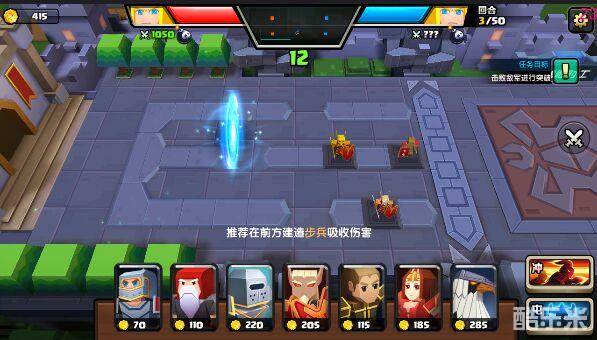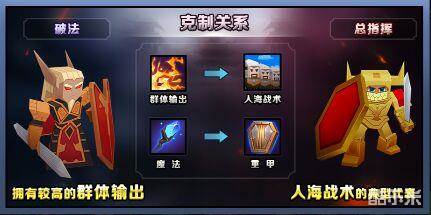 在挑战模式中,我们需要面对的是一个总指挥以及2个队长,典型的人海战术,而克制人海战术,破魔师是一个非常不错的选择,第一是群体攻击,第二是破魔师的魔法攻击能够对总指挥以及队长造成130%的伤害,但是破魔师也有弱点,因为破魔师是中甲,总指挥的普通攻击对破魔师同样能够造成130%的伤害,因此我们除了破魔师之外还需要一个前排,本次挑战中我们选择了队长作为前排(金币不够升级总指挥),同时在侧面再补一个破法。