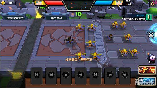 在本关挑战中,我们没有援军,也没有经济,需要抵挡对手的3波攻势,那么这关的重点就是考验玩家对驻守的使用时机了,我们需要在对面的第二波部队交接到我方阵营前时,一次驻守炸掉敌方的所有单位,然后形成一波突破,来获得游戏的胜利。PS:驻守的使用有范围限制哦,只能在我方基地使用。