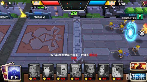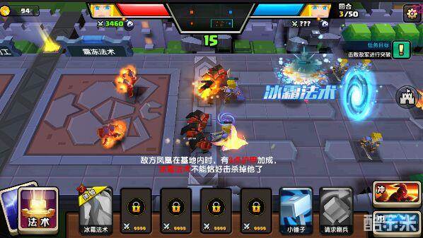 挑战模式的第三章中,我们开始熟悉《战就战》中的其他法术,在第一关中,我们需要了解的就是冰霜法术的运用。冰霜法术的效果是:对200范围内的一个随机单位释放霜冻,每次造成180点魔法伤害,CD30秒,根据技能等级释放2/4/6次,最高3级。本关中,我们获得的是3级的冰霜法术,可以击杀满血的凤凰,和30秒的CD时间又和出兵时间是一致的,我们需要注意的则是冰霜法术由于是范围随机单体伤害,因此在释放时,需要保证范围内就凤凰一个单位。