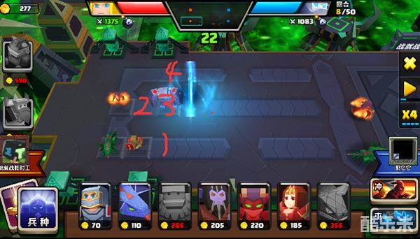 下面进入本文的核心内容,我们先从开局说起。开局造兵在传送门之后的好处已经被广大玩家所知晓,我就不再赘述。不过就算在传送门之后的摆位,依旧有略微差别。如上图,有些玩家喜欢放在最后一排,有些玩家喜欢放2号位或者3号位,而我推荐的位置是1号位。首先假如我们开局要造一个掠命者,那么对于掠命者来说,最大的天敌莫过于大科多,如果我们将掠命者建造在2号或者3号位,那么一旦对面针对型的出科多,我们要么面临崩盘的风险,要么只能退而求其次补一个大肉在传送门前。而建造在1号位则可以为之后的反针对埋下伏笔。无论之后在2号位还是3号位建造大肉来避免科多的针对都是非常有效的。在最后,再来说说为何不讲前排兵种建造在最后一排,首先战就战的AI判定是进入攻击距离后不再移动,自动进入攻击,而一般远程兵种的攻击距离在400左右,如果将肉造在最后一排的位置,那么你的后排输出兵种也只能和前排肉一起建造在最后一排,以400攻击距离的远程+100攻击距离的近战举例,在双方兵线交接后,你的远程兵种将在距离敌方近战250距离的位置进行攻击,距离己方前排的距离则是150。而随后,我们则需要考虑几个兵种的技能,大酋长的粉碎,以攻击目标为中心的250距离,必然能攻击到我们的后排。地狱火的灼烧(烈焰护盾),300的灼烧距离同样能够伤害到我们的后排,除此之外,还有幽冥鬼王,魔导师的烈焰斩等技能都可能再距离过近下伤害到我们的后排,因此本人是不建议将后排输出单位和前排肉建造在同一排的,尤其是对战前期。