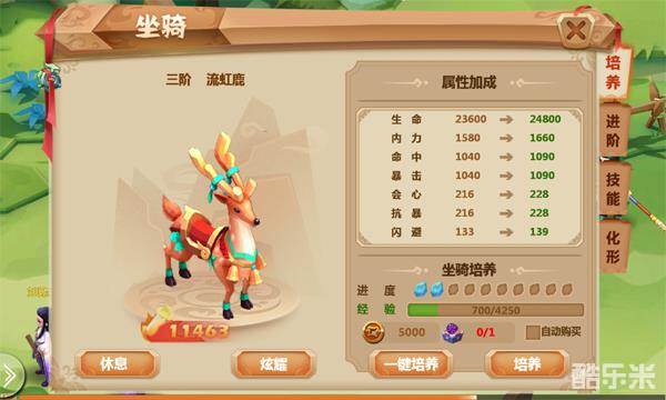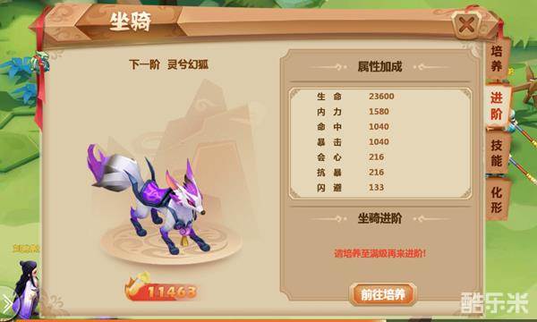 3、成功进阶后会提升一定属性并改变坐骑外形,同时重置培养次数,坐骑品阶达到上限时就不能继续进阶。