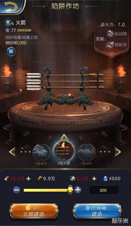 陷阱作坊一共有三大类的陷阱,分别是落石、火箭和滚木。他们会对不同的兵种有着克制的关系,也会随着陷阱作坊等级的提升而解锁更高级别的陷阱,高级别的陷阱拥有更高的战斗力和克制能力。落石类的陷阱对于盾兵和枪兵这类步兵有着克制的效果,火箭则是对于近战骑和骑射手这类骑兵有着克制的效果,滚木则是对于弓兵和弩兵这类弓兵有着克制的效果,因为克制关系不同,所以对于不同的陷阱需要协调发展哦!