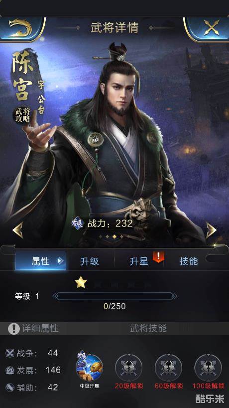 陈宫,蓝色品质,发展系武将,初始战力232。属性数值:发展146>战争44>辅助42。