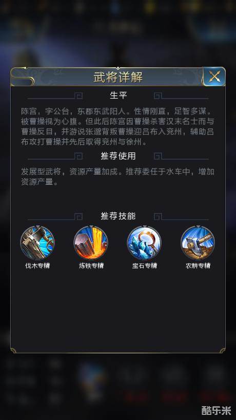 陈宫是发展型武将,让各位领主资源产量有较大加成,所以推荐以下技能供各位主公选择并学习:伐木专精、炼铁专精、宝石专精、农耕专精。