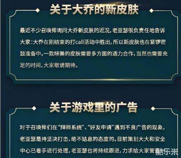 由于大乔在前段时间的团战精神投票中脱颖而出,因此她的专属皮肤也正在紧锣密鼓的制作中,不过从策划的描述来看,大家可能需要等得久一些,大家准备好Money等着新皮肤的出炉吧。此外玩家们在游戏过程中总是遇见广告的现象,策划们也表示将会严肃处理,这种情况以后应该能得到遏制吧。