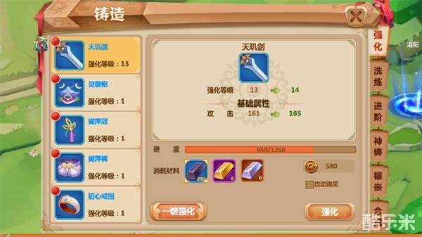 装备的强化等级升级时,有一个经验值,经验值升满后则可以到下一个等级。而增加经验的方式则是消耗材料和铜钱,小编来说一说这材料的区别。材料一共分为三种,分别为:寒铁、冥铜和秘银,每种材料提供的强化经验是不同的,寒铁最少,冥铜适中,秘银最多。每次升级时,都会有一定几率产生暴击,可以获得额外的经验值呢,大家多多洗洗手来升级,说不定能获得成倍的经验!