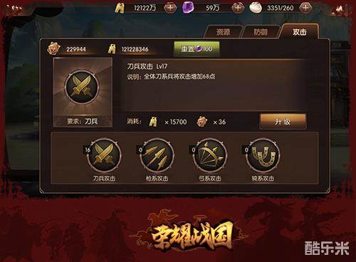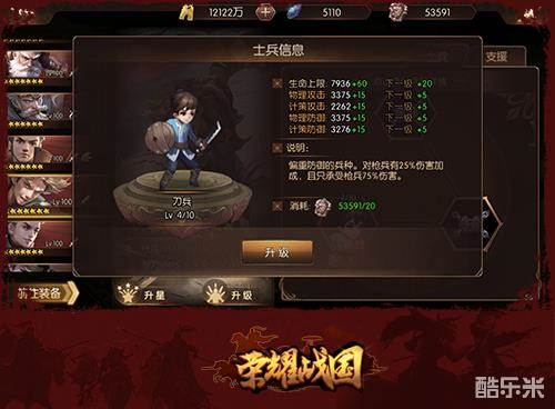 在《荣耀战国》中武将又被分为刀、枪、弓、骑四个兵种,并携带对应兵种的士兵一起作战。所以玩家除了可以对武将进行培养之外,还可以通过提升士兵的各项基础属性,以及完成兵种进阶来增强军队战斗力。
