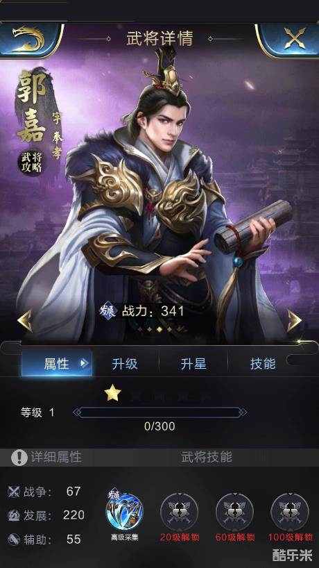 郭嘉,紫色品质,发展系武将,初始战力341。属性数值:发展220>战争67>辅助55。
