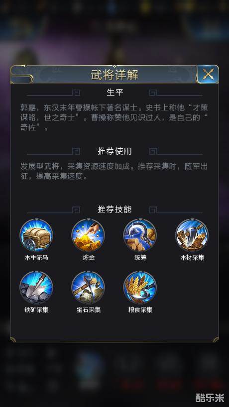 其中木牛流马技能是增加部队负重的,炼金、木材采集、铁矿采集、宝石采集、粮食采集分别增加金矿和各种资源采集速度,统筹可以在采集时额外掉落资源箱,都是非常适合郭嘉的技能。