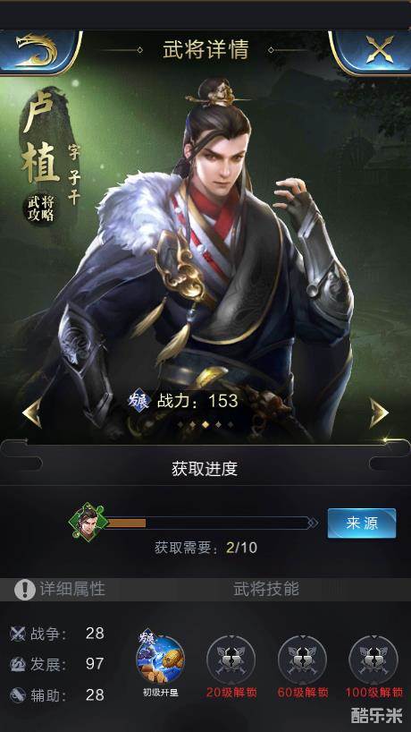 卢植,绿色品质,发展系武将,初始战力153。属性数值:发展97>战争28=辅助28。