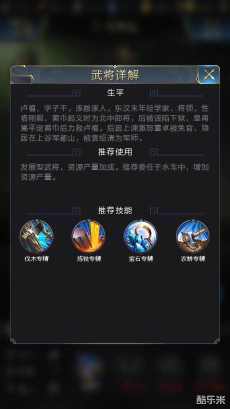 卢植是发展型武将,让各位领主资源产量有较大加成,所以推荐以下技能供各位主公选择并学习:伐木专精、炼铁专精、宝石专精、农耕专精。