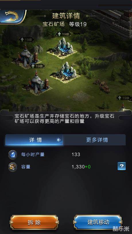 点击想要拆除的宝石矿场,选择“详情”按钮,在详情界面会有“拆除宝石矿场”和“建筑移动”两个按钮。