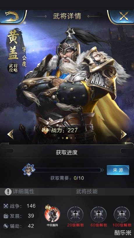 黄盖,蓝色品质,战争系武将,初始战力227。属性数值:战争146>辅助42>发展39。