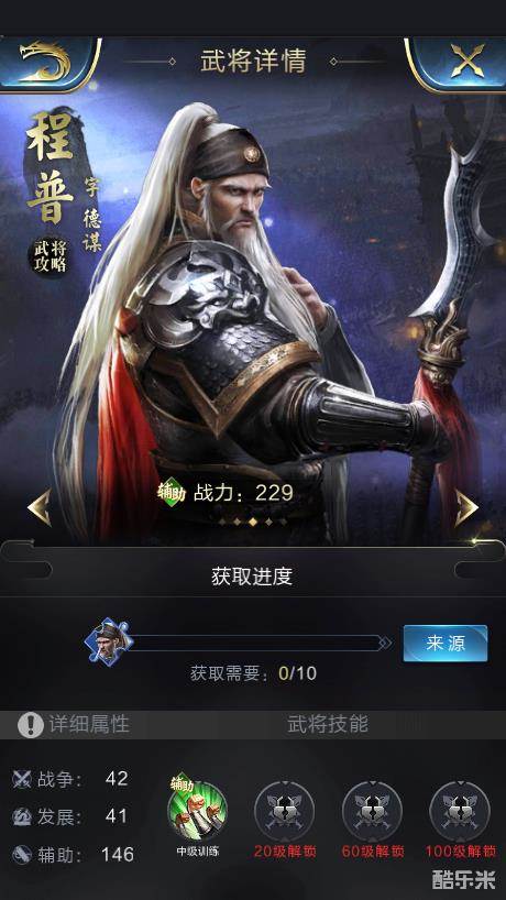程普,蓝色品质,辅助系武将,初始战力229。属性数值:辅助146>战争42>发展41。