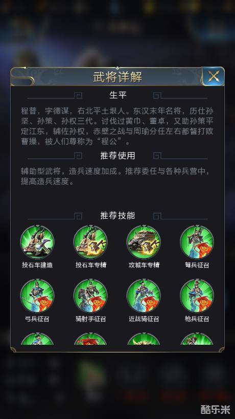 程普便是这样一名我们可以安心把他委任在各兵营的武将,强力的固有技能,配合我们推荐学习的技能,可以更快更多的早出大量兵,让我们的部队防御无敌、无懈可击。