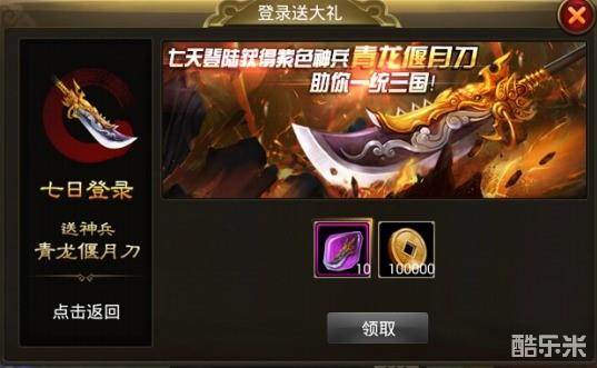 【活动奖励】首日登陆:铜币*10W、100元宝、1000历练、1个不签符连续登陆二天:天使之翼、20W铜钱、2000历练、10个战魂连续登陆三天:三阶坐骑进阶材料箱(一套)、30W铜钱、5个刷新符连续登录七天:神兵-青龙偃月刀、50W铜钱、5000历练、10个刷新符
