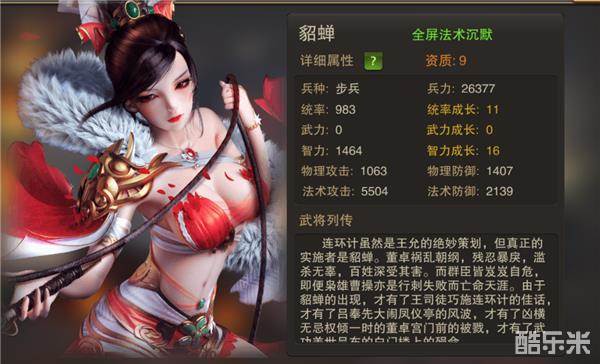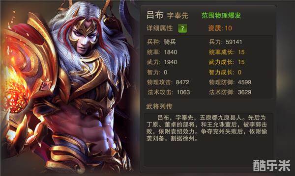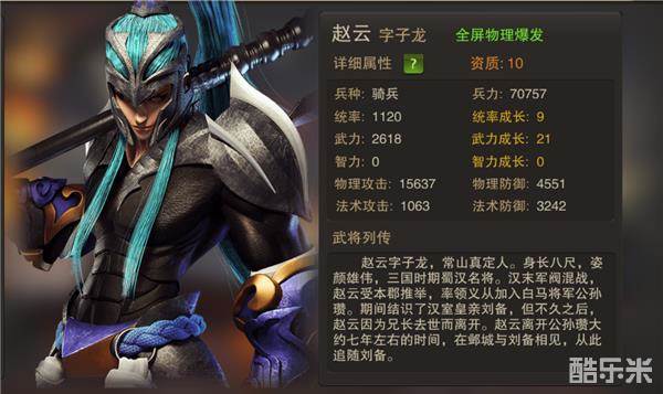 同吕布、赵云一样,同为最高10资质武将,拥有最强的成长空间,具备游戏最高的法术爆发伤害。