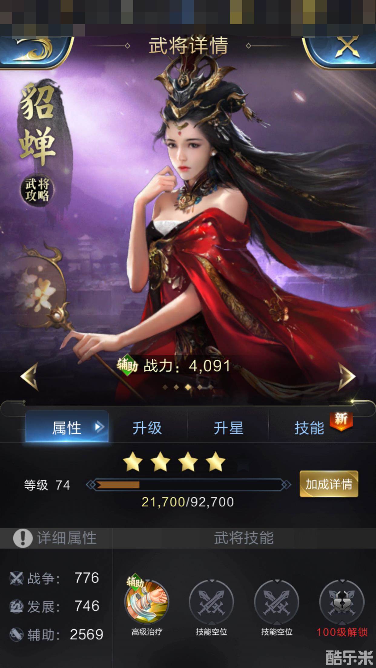 貂蝉,紫色品质,辅助系武将,初始战力347。初始属性数值:战争65,发展62,辅助220。