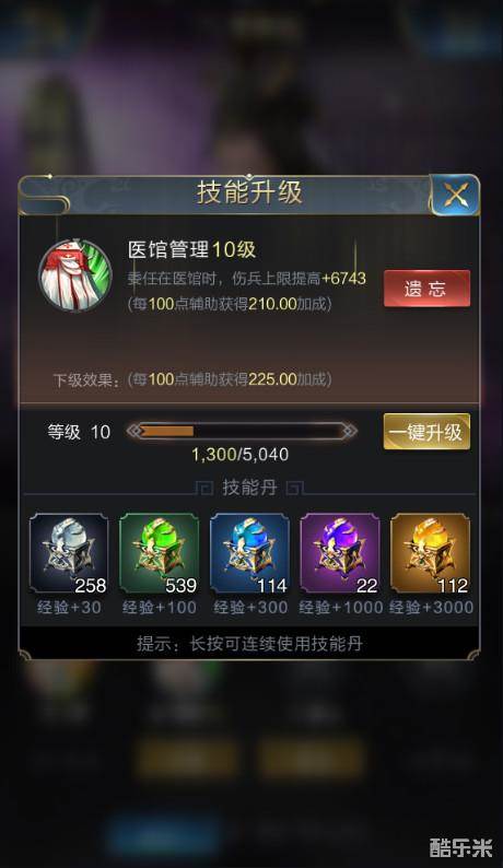 2、技能升级:通过技能研究、商城购买等方式获取技能丹对武将技能进行升级,初级技能丹、中级技能丹、高级技能丹、极品技能丹、绝世技能丹可分别为技能提升30、100、300、1000、3000经验。