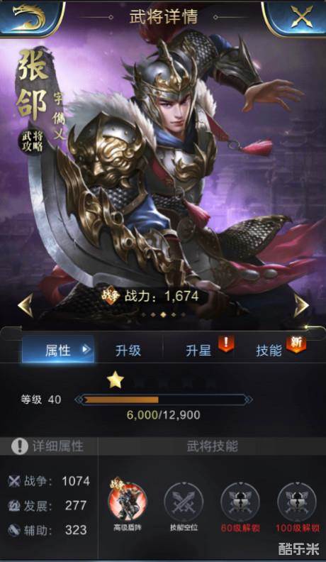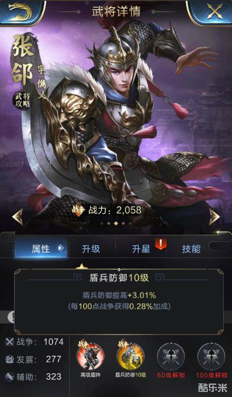 张郃,紫色品质,战争系武将,初始战力350。初始属性数值:战争225,发展58,辅助67。