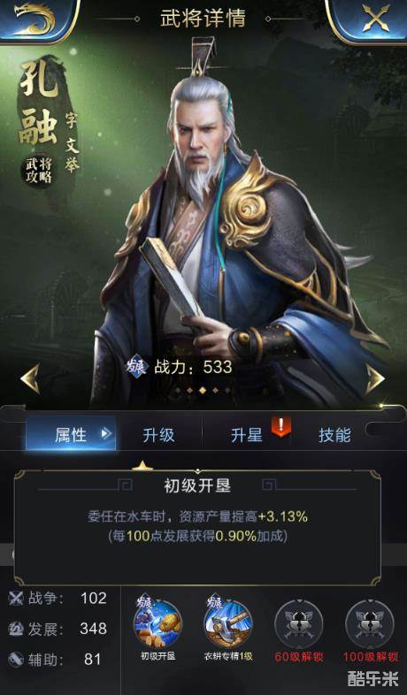 孔融作为一名绿色武将,并没有很突出的属性,带领军队采集和攻击相当的悲剧。不过其获得简单,固有技能开垦用在委任风车上收益明显,搭配风车相关的武将技能,做为风车委任专用将使用是非常不错的选择。