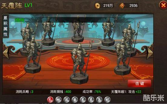 乱世三国如迷阵,杀机暗藏,行走其中如履薄冰,稍有不慎将万劫不复。手游《无双之刃》再现破阵系统,面对守阵八大石像,必须全部击破才可进入下一个阵法,不同的击破口,将获得不同的属性,每个阵法增加的属性不尽相同,主公们赶紧来过关斩件,成就破阵绝杀,一剑封关的荣耀吧!