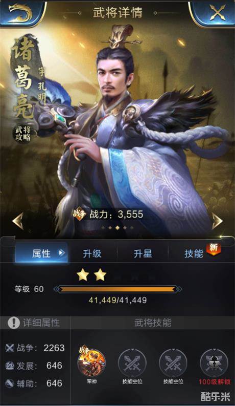 诸葛亮,橙色品质,战争系武将,初始战力506。初始属性数值:战争323,发展92,辅助92。