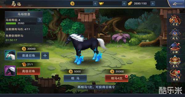相马需要从马场进行,也就是说,马场是存储战马的地方,这个与古代的功能是一样的。同时马场有等级之分,玩家每次开始战马召唤后都能累积马场经验,高级召唤相比普通召唤获得的经验更多。马场的等级提高,免费存储普通野马上线增加免费恢复野马时间减少。借此即使玩家离线也能进行战马召唤次数累积,待玩家上线后就可以免费进行相马。