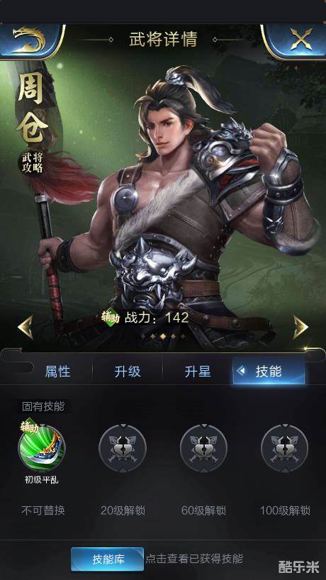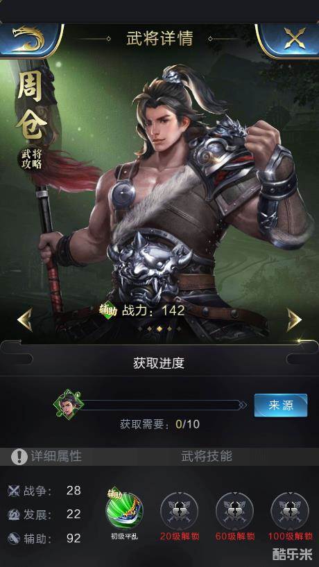 周仓,绿色品质,辅助系武将,初始战力142。属性数值:辅助92>战争28>发展22。