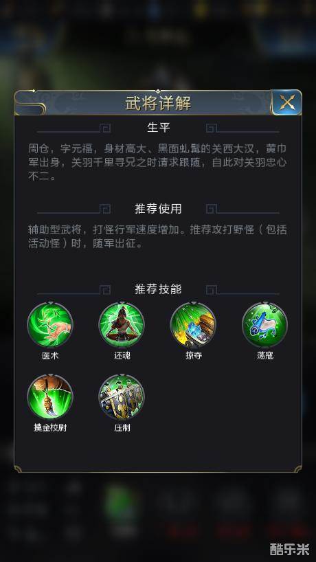 周仓是辅助型武将,让各位领主打怪行军速度增加,所以推荐以下技能供各位主公选择并学习:医术、还魂、掠夺、荡寇、摸金校尉、压制。