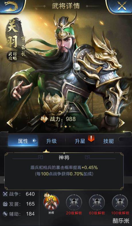 关羽,橙色品质,战争系武将,初始战力494。初始属性数值:战争320,发展82,辅助92。