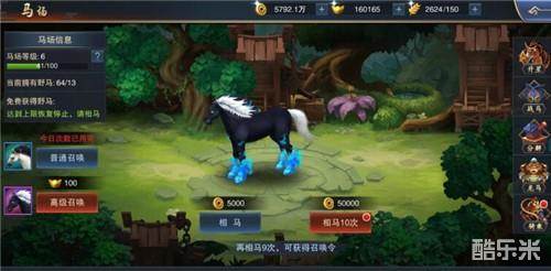 战马召唤又分为普通召唤与高级召唤,前者需要花费铜币,后者则需要消耗召唤令或者是元宝。玩家开始战马召唤后每次都能积累马场自身的经验,随着马场自身等级的提高,能够提升玩家免费相马的效率。