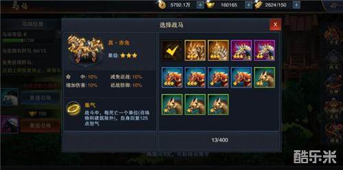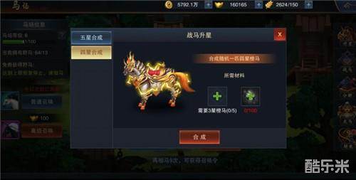 战马之间存在着品质高低的区别,根据属性由低到高可以分为:绿、蓝、紫、橙、红五种品质,在取得低品质的战马之后,可以通过升星来提升战马的战斗力。除此之外,还可以通过在马魂孔上镶嵌马魂石来给予战马额外的增益,每匹战马最多有5个马魂孔,全部装备完毕后就会成为一匹实力超群的良驹。在培养完毕后,就可以让武将骑乘,大大提升战斗力。