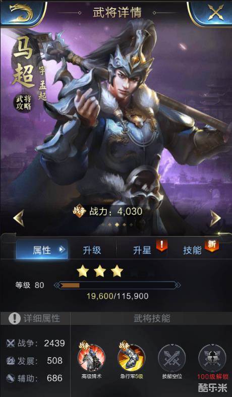 马超,紫色品质,战争系武将,初始战力344。初始属性数值:战争232,发展48,辅助65。