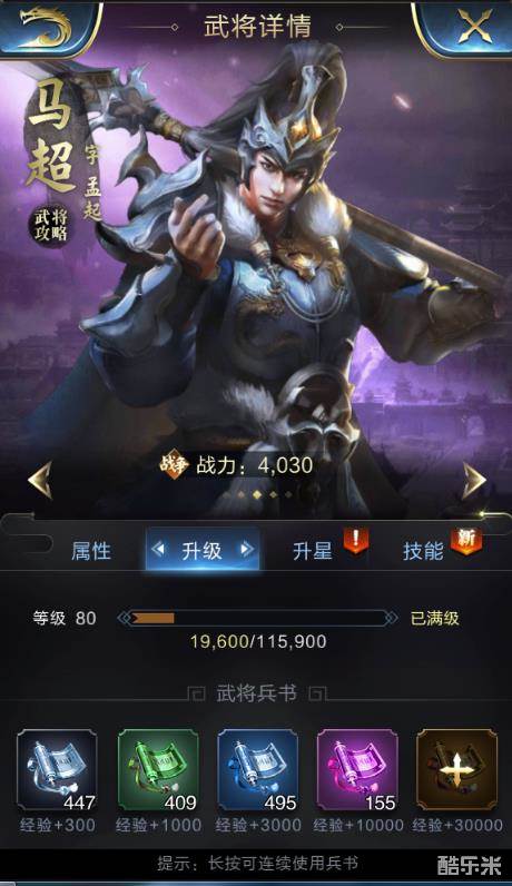 3、升阶与升星:通过马超将魂或者万能将魂进阶,满阶后可以升星,最高为五星。