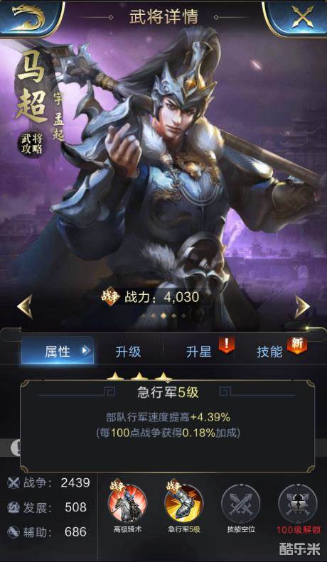 马超做为紫色武将,其各方面属性都非常的卓越,且获取难度很低。其固有技能高级骑术决定了他的发展方向为攻城类武将。围绕攻城类武将的特性,进行搭配学习技能,能发挥出更强的战斗力。