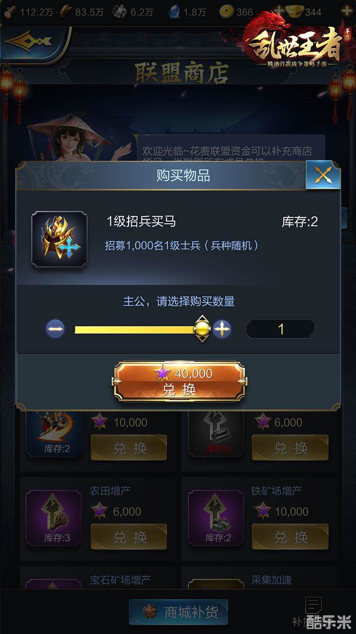 1级招兵买马使用以后可以立即使得主公获得1000名随机的1级兵种。价格是40000点个人积分,大致上来说这个道具我认为是所有联盟商品中最为有用,性价比最高的。因为想要获得士兵除了老老实实征兵之外,就只剩这一条快速获得士兵的办法了,而且没有其他的地方能够买到直接获得士兵的道具(除了一些活动和任务)。另外,立即获得1000名士兵不需要耗费任何资源,也无需等待,士兵直接出现在校场,可以立刻为主公出城征战。