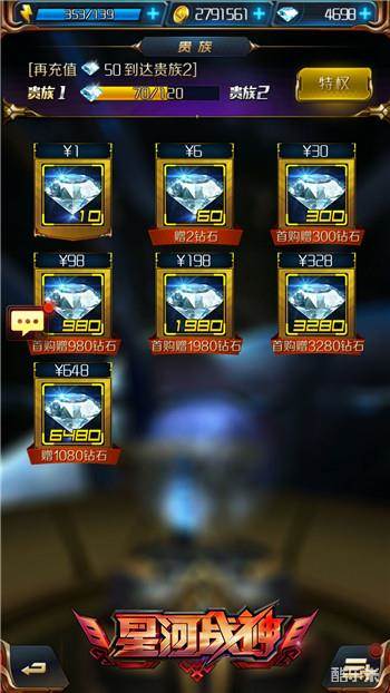 最后编辑于7年前尽管这个标题有些俗气,但是胜在重点突出。无论在哪个游戏中,都有一种不可缺少的货币,在《星河战神》中那就是钻石。更俗气的就是,常常坐拥大量钻石的玩家会被我们称呼为土豪、大腿,甚至会很嫉妒的说上一句有钱真任性。但是没有谁一直愿意当土鳖,所以今天我们要向钻石发起一次进军。