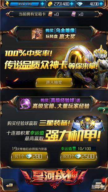 接着是寻宝,因为抽奖是最快获得机甲和装备的方式,而且更有传说品质众神卡能收获,想想都是美丽的。